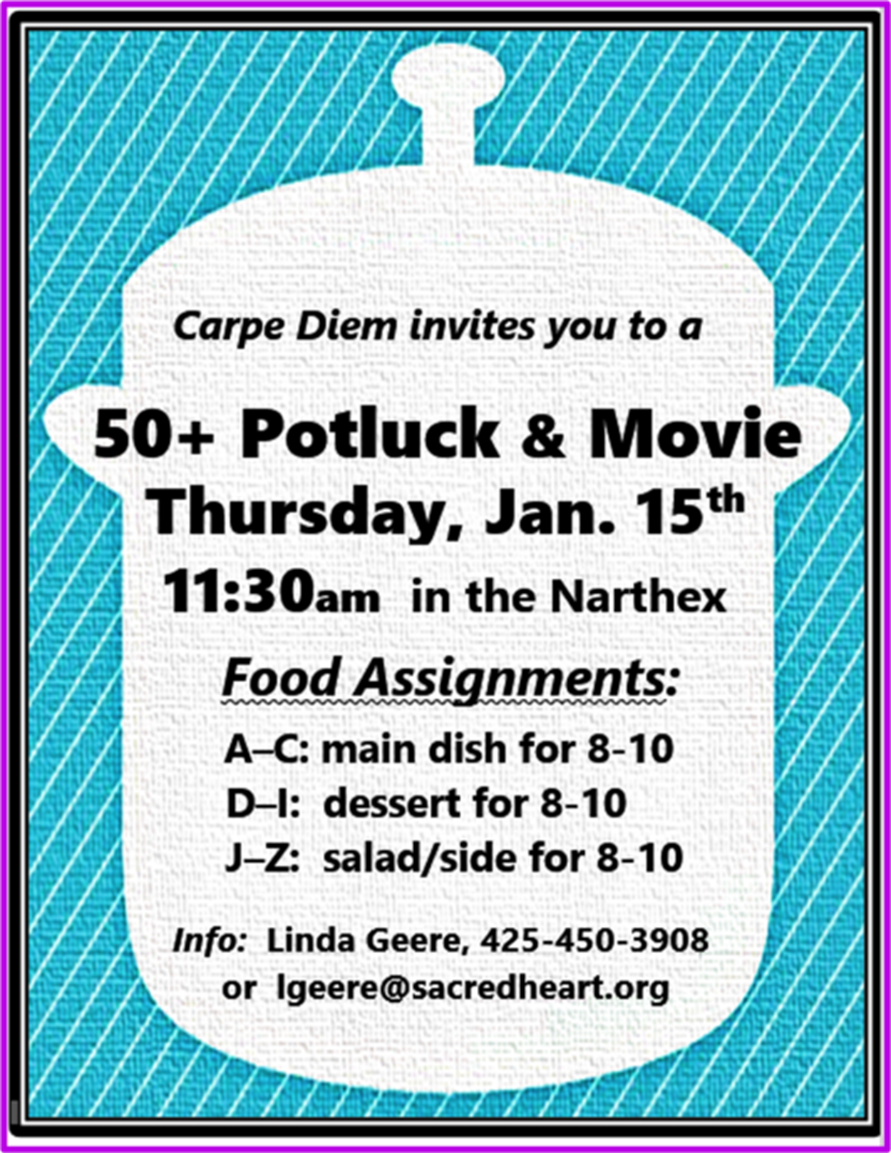 Those who are 50 years of age and older, are invited to the Sacred Heart Carpe Diem group January Potluck and Movie. This event will be held on Thursday, January 15, at 11:30AM at Sacred Heart Church in Bellevue.