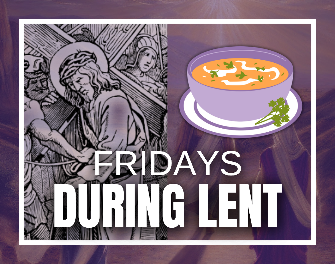 Following stations of the cross, on each Friday of Lent, there will be a meatless soup supper. Each week will be hosted by a different ministry or group from our parish community.