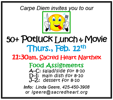 If you’re 50 or older, you’re invited to a Potluck Lunch at Sacred Heart on Thursday, February 12. Questions? Contact Linda Geere at lgeere@sacredheart.org.