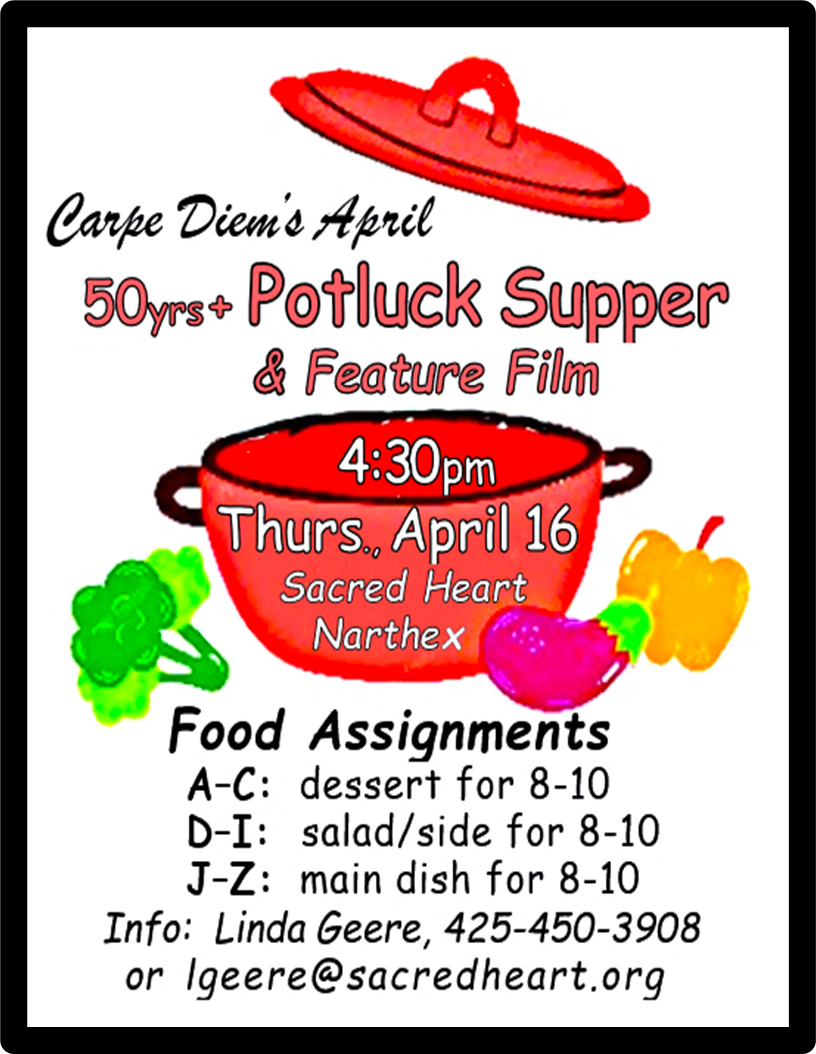 Thursday, April 16, 4:30PM Potluck Supper. For more info, contact Linda Geere at 425-450-3908 or
