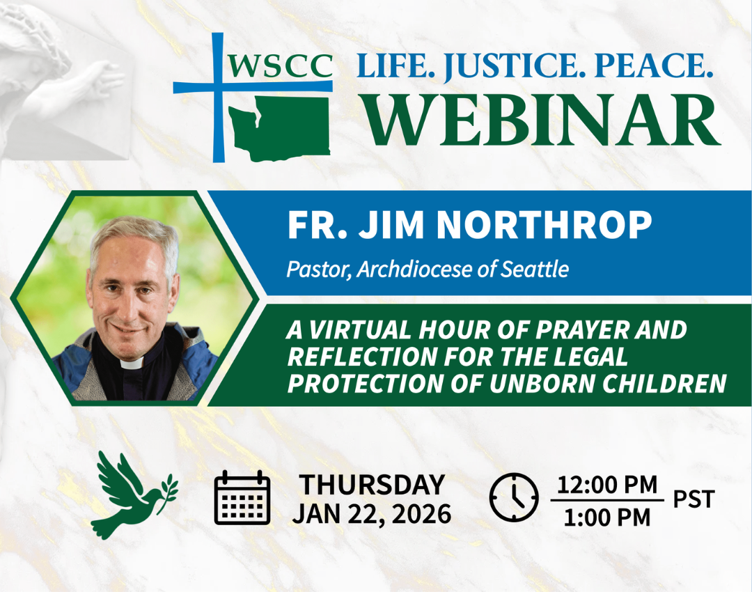 The Washington State Catholic Conference, the public policy voice of the bishops of Washington State, has been hosting a series webinars on topics relevant to today’s world. The next webinar will be held on January 22, at 12PM. Join Fr. Jim Northrop for a virtual hour of prayer focused on defending the unborn children and promoting a culture of life. This time of reflection supports our shared mission to uphold the inherent dignity and protection of every child. Be an advocate for Life, Justice, and Peace. Register for the Zoom meeting at: bit.ly/4iwyCGB